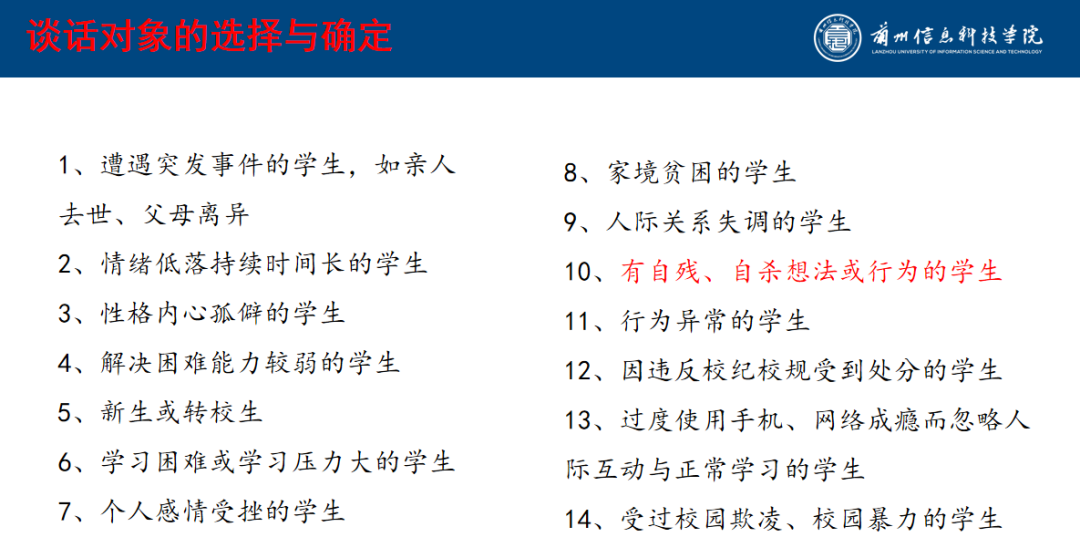 针对“如何精准识别需要帮助的同学”这一关键问题,培训明确了四类核心谈话对象:主动寻求交流或心理疏导的同学、经观察发现情绪低落、行为反常的同学、辅导员重点关注的同学,以及经历特殊/重大事件的同学。在谈话场景选择上,推荐空教室、校园咖啡厅等安静、私密、舒适的场所,同时避开嘈杂走廊、随时有人闯入的空间等不适宜场景,为有效沟通营造良好环境。