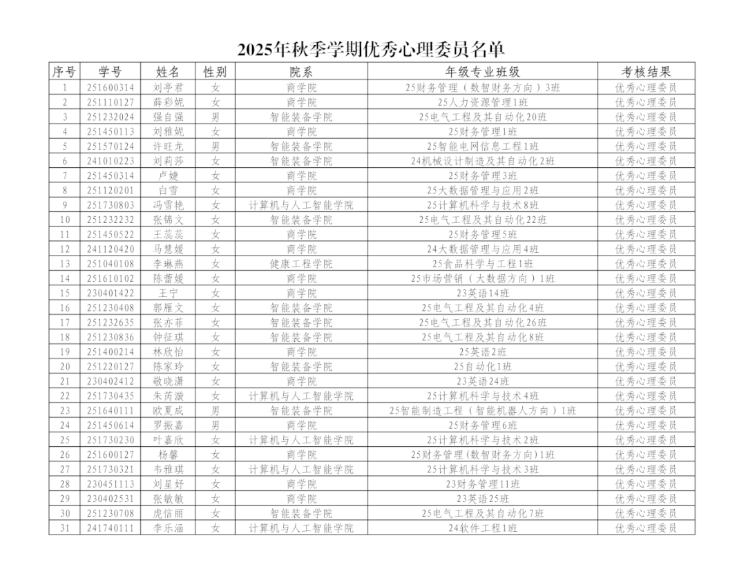 根据考核结果,共有187名心理委员成绩合格,将获得培训合格证书;根据学习笔记、培训考勤、参与活动、值班考勤、考核成绩等综合评定,评出“优秀心理委员”61名(名单见文末)。针对考核成绩不合格的心理委员,心理健康指导中心将制定专门培训计划,继续组织基础知识和专业技能学习。