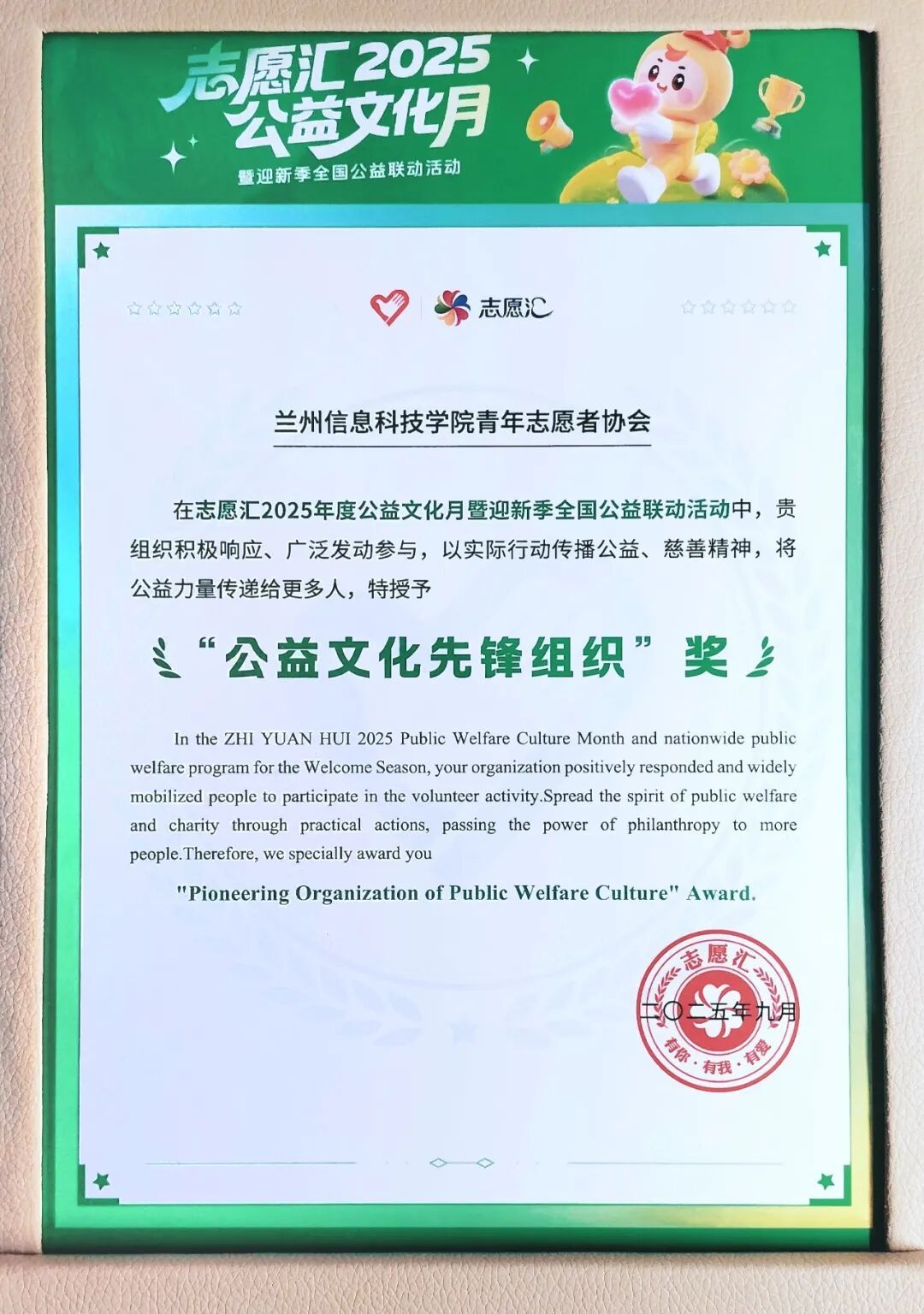 近日,“志愿汇2025年度公益文化月暨迎新季全国公益联动活动”落下帷幕,我校青年志愿者协会凭借出色的组织动员能力、扎实的公益行动实践与广泛的公益文化传播力,从全国877家志愿服务组织中脱颖而出,斩获全国高校榜单第8名,荣获“公益文化先锋组织”荣誉称号,为我校志愿服务工作再添全国性亮眼战绩。