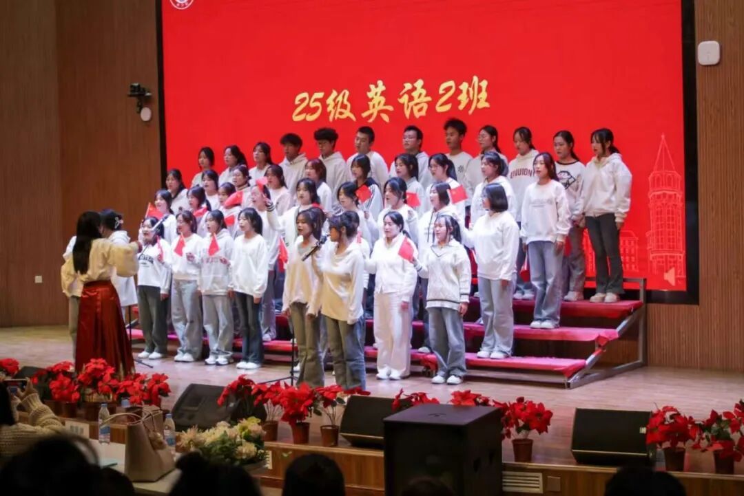 各班依次登台,或以红色经典曲目追忆峥嵘岁月,或以青春励志歌曲诉说奋斗理想。明快的旋律、嘹亮的歌声与整齐的队列,不仅展现了同学们的艺术素养,更彰显了商学院学子同心聚力的集体精神,赢得现场阵阵掌声。